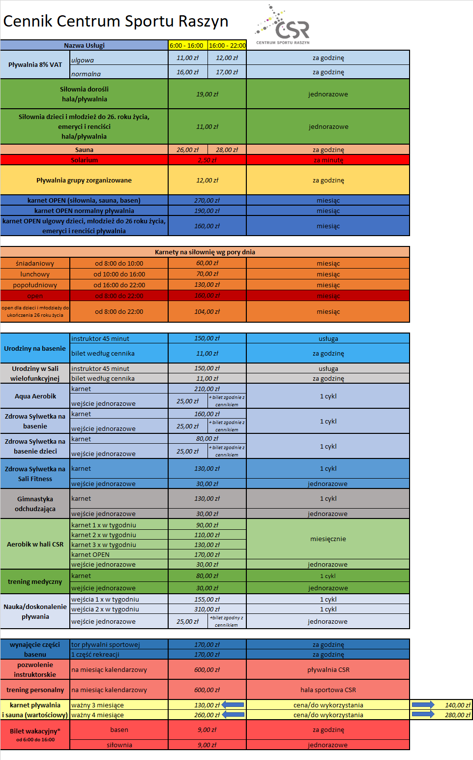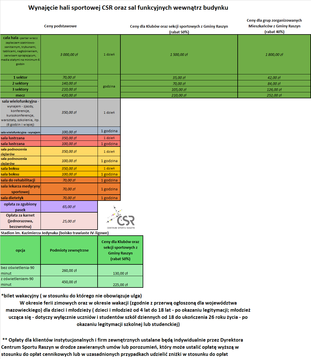 Cenniki Do pobrania Wynajęcie hali sportowej CSR oraz sal funkcyjnych wewnątrz budynku 89.43 KB (PNG) Pobierz Cennik Centrum Sportu Raszyn 111.43 KB (PNG) Pobierz