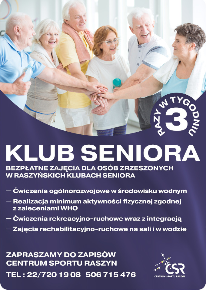 Zajęcia gimnastyczne przeznaczone dla członków Klubów Seniora z terenu Gminy Raszyn. Miejscem zajęć są sale gimnastyczne: w Centrum Kultury w Raszynie, w Klubie Seniora na Falentach oraz w sali parafialnej kościoła w Sękocinie. Prowadzącym jest Pan Robert Jancik – wykwalifikowany instruktor. Celem zajęć jest zadbanie o dobrą kondycję i formę fizyczną osób w wieku powyżej 60 roku życia.